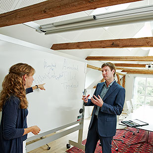 Strategi og Mennesker træner menneskers evne til at være i konstruktiv dialog og til at træffe ansvarlige beslutninger. Her ses seniorkonsulent Ulla Fink og udvilingschef Rasmus Brandt. Foto ved fotograf Ole Mortensen/Tilsted Com. |